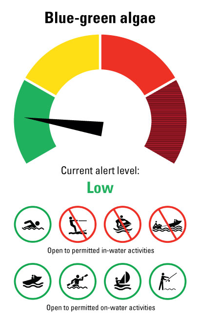 To protect visitors from exposure to blue-green algae toxins, some water-based recreation activities are restricted when algae levels indicate a potential health risk.